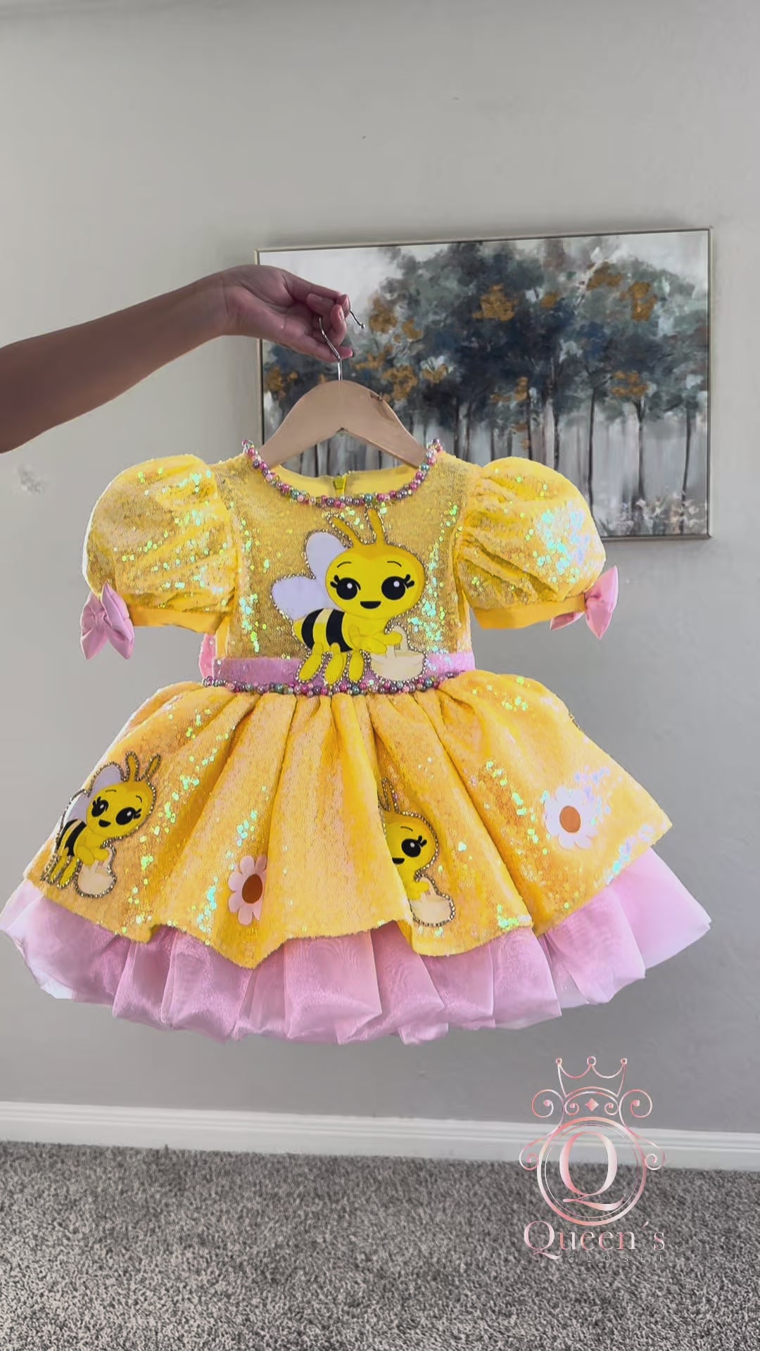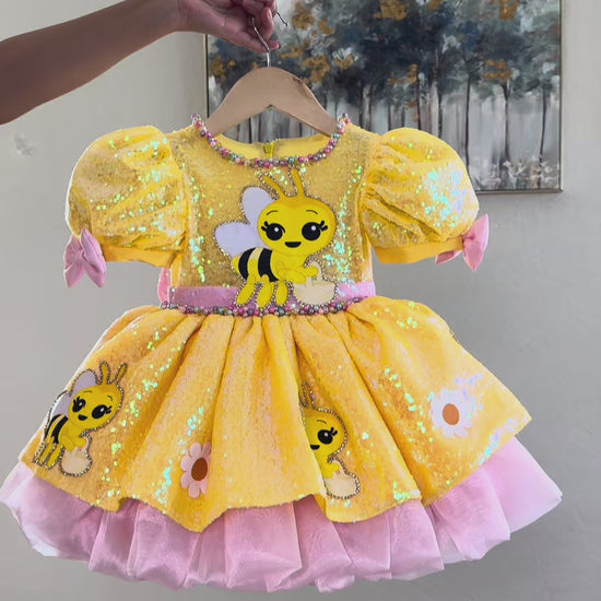 This beautiful model features a shimmering yellow silhouette full of sparkle, paired with soft pink accents that add the perfect touch of sweetness and charm. The adorable bee details, puffy sleeves, and voluminous skirt make this dress a truly eye-catching piece for little girls who love fun, color, and magical outfits. ✨💖