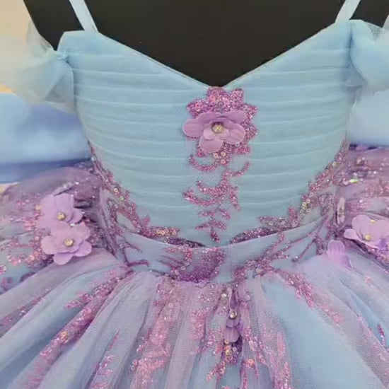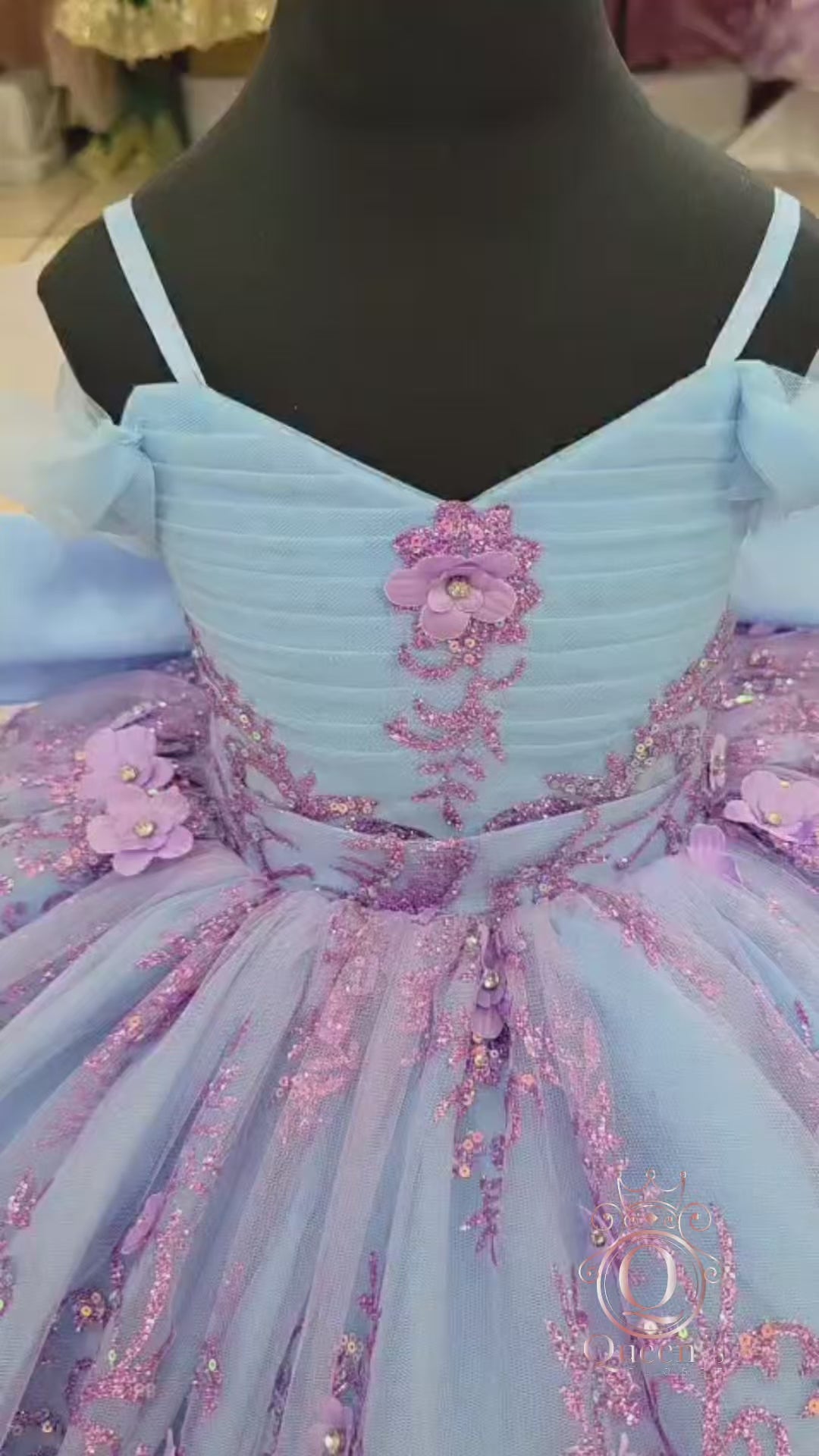 Designed in a breathtaking blend of soft sky blue and enchanted lavender 💜💙, this gown glows with layers of shimmering tulle embroidered in delicate floral lace, each detail catching the light like whispers of fairy dust ✨🌸. The volume flows effortlessly, creating that unforgettable entrance — the kind that makes hearts pause and eyes sparkle 💭👑.