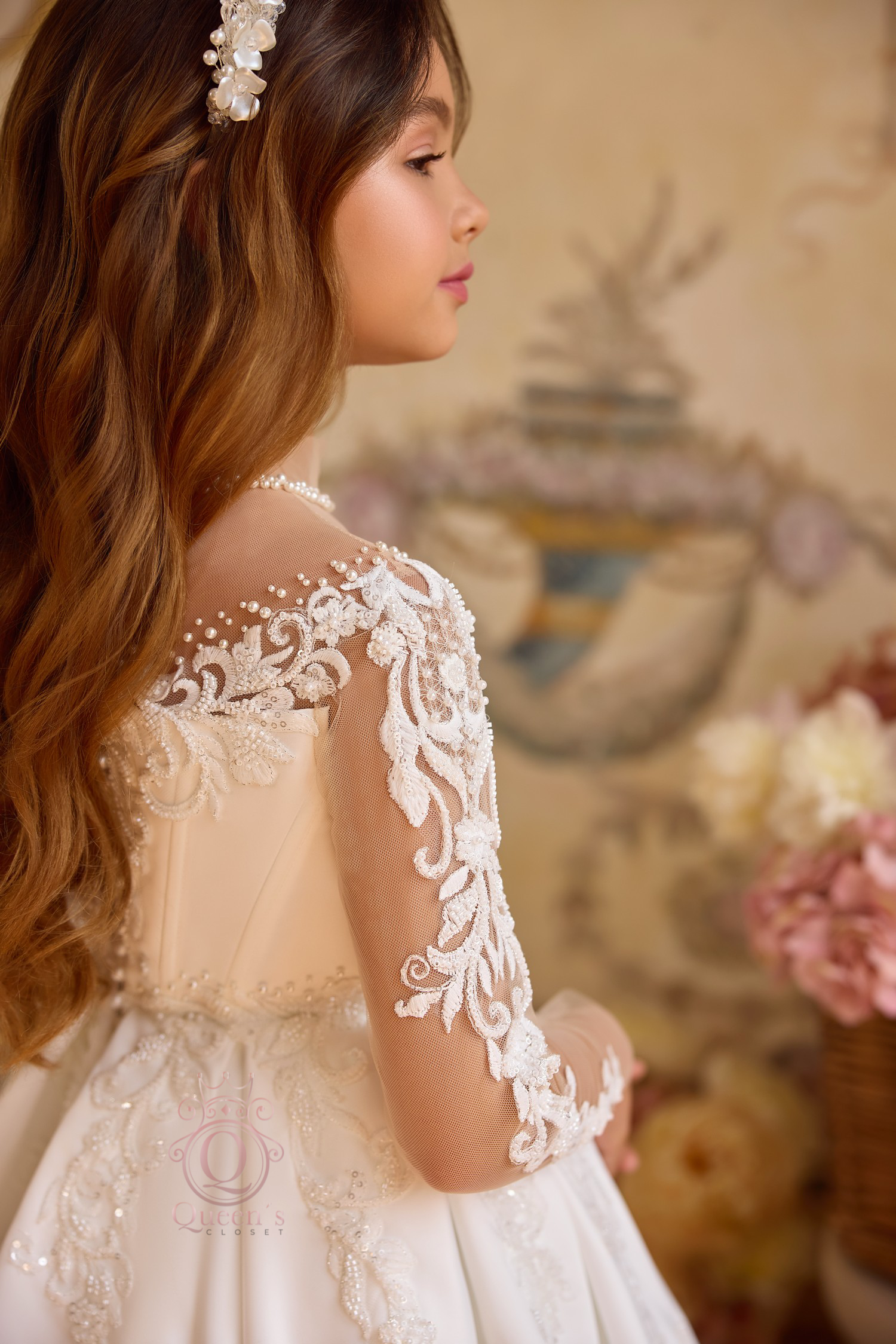 A masterpiece of timeless elegance, this exquisite gown is designed for the little girl who deserves nothing less than perfection on her sacred day. Crafted with meticulous couture artistry, the dress features delicately embroidered lace sleeves, adorned with pearls and sequins that shimmer softly with every movement.