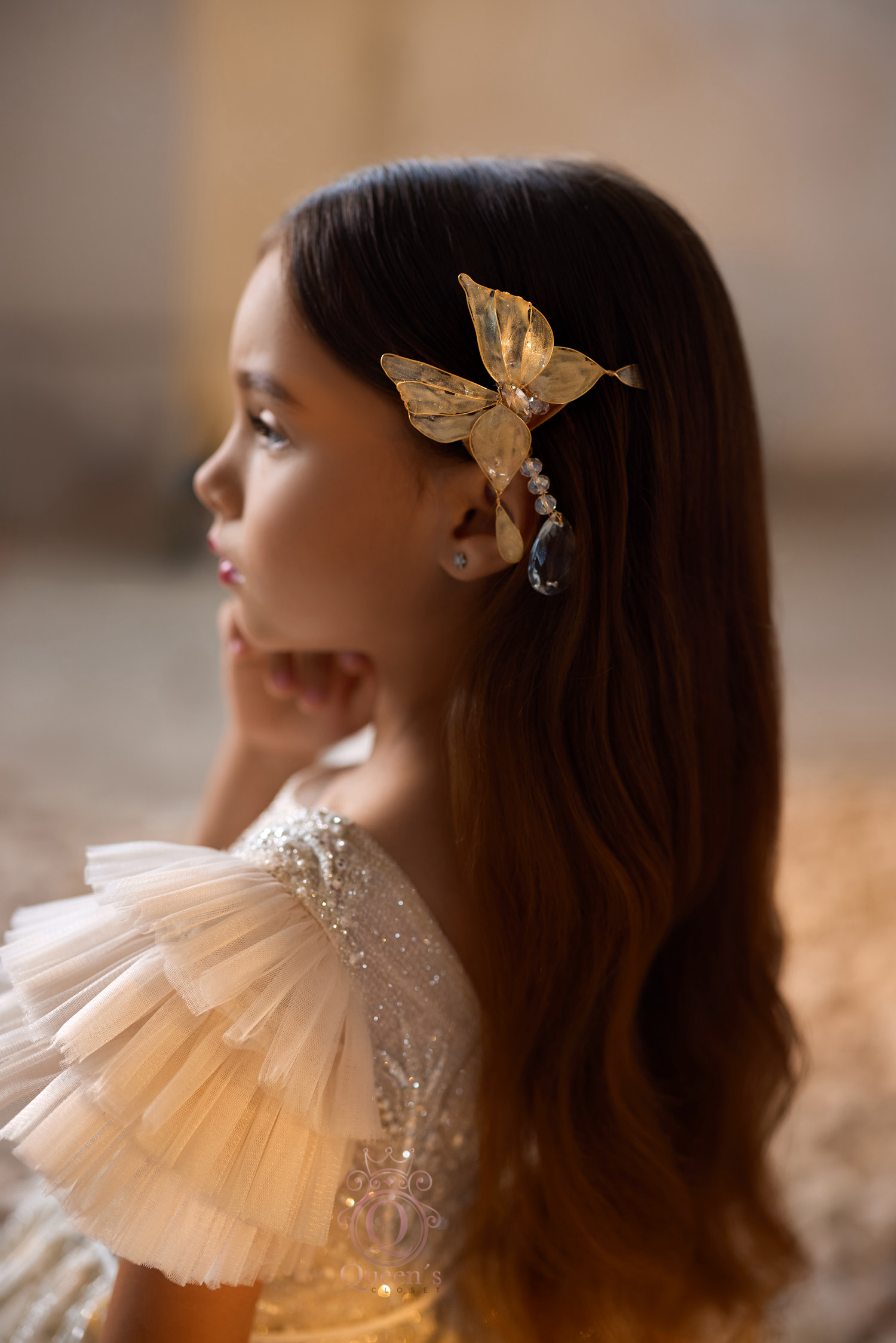 🌸🍃 The sleeves bloom in pleated clouds, each fold placed with the same care as a ballerina’s tutu — soft, fluffy, perfectly balanced. It gives the dress movement before she even takes a step. 🌬️🎀