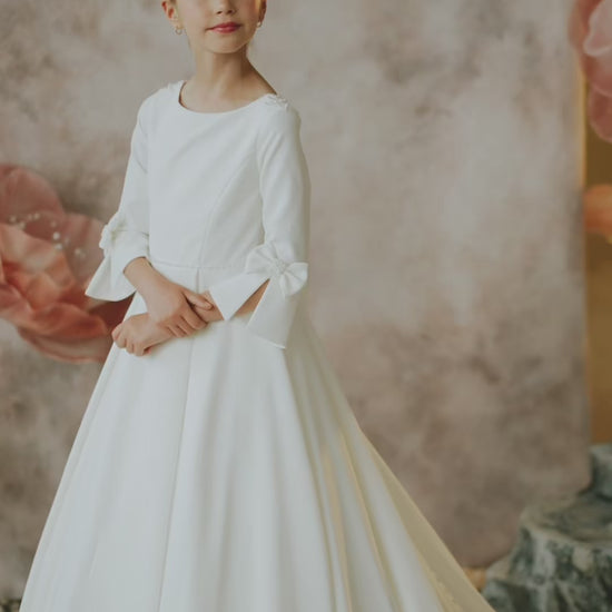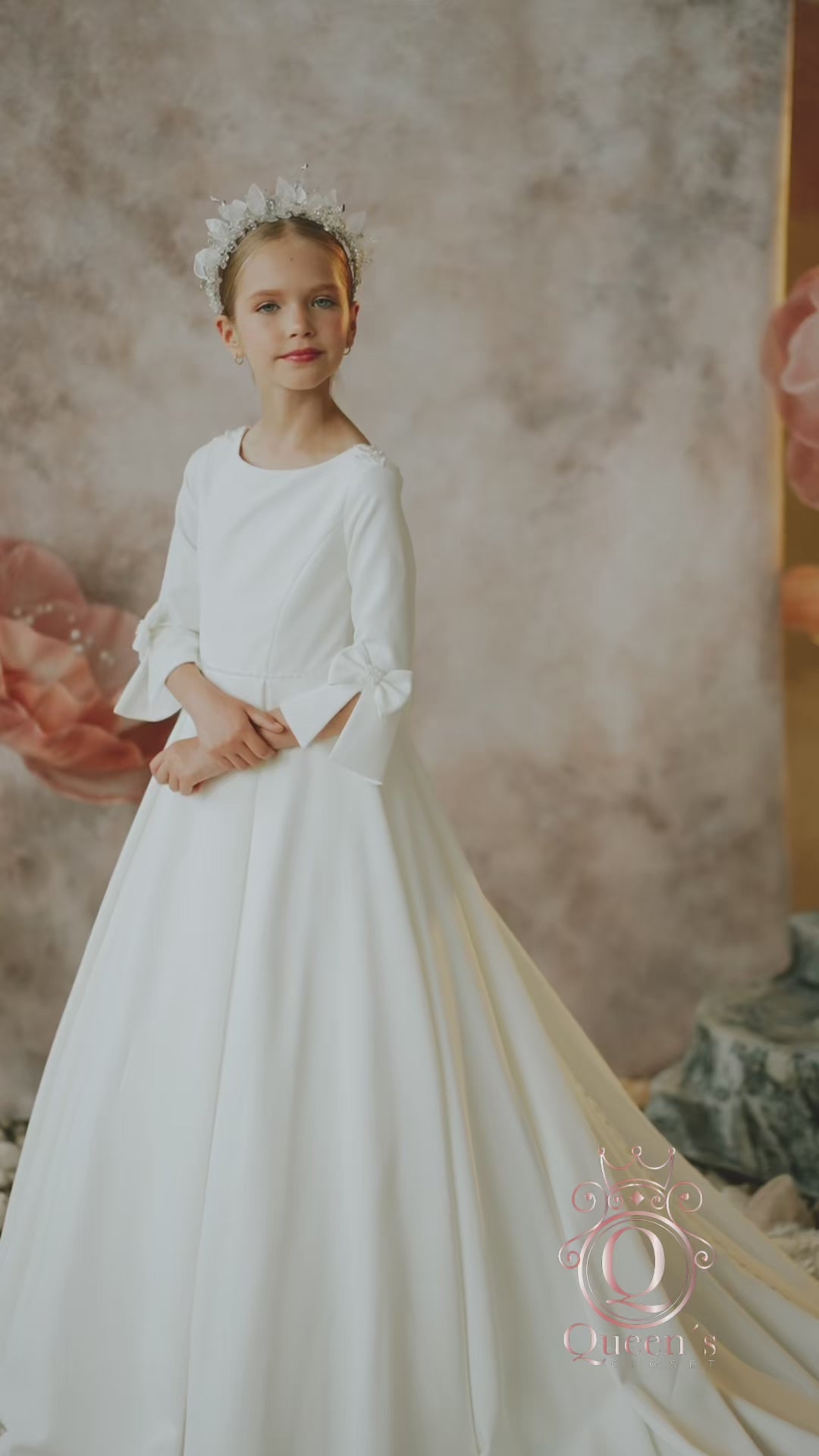 Transform her special day into an unforgettable celebration with our luxury First Communion dress. This stunning gown is adorned with exquisite details, including pearls and sequins on the back, adding a touch of glamour and sophistication. The train features a delicate lace overlay with 3D floral appliqués, creating a dreamlike effect that she will cherish forever.