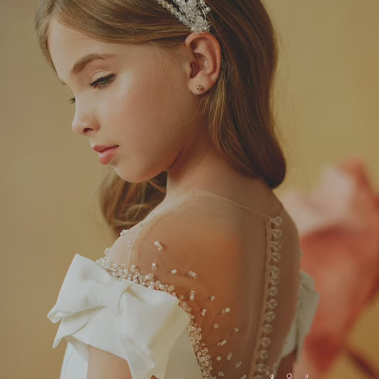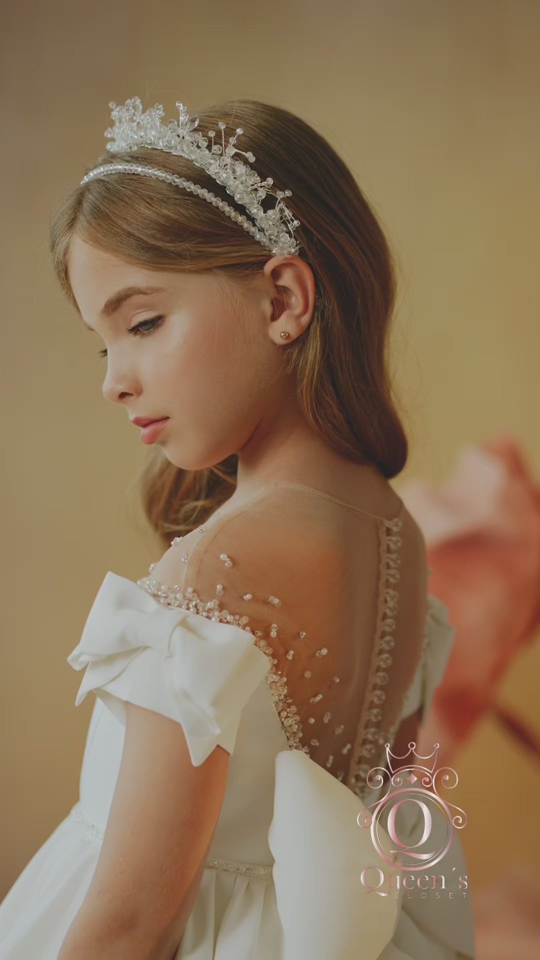 Make her First Communion a moment to remember with a luxury dress that combines timeless elegance with contemporary charm. This exclusive gown is meticulously crafted with pearls, sequins, and delicate bows, adding a touch of sparkle and grace. Each detail is thoughtfully designed to highlight her beauty and celebrate her faith.