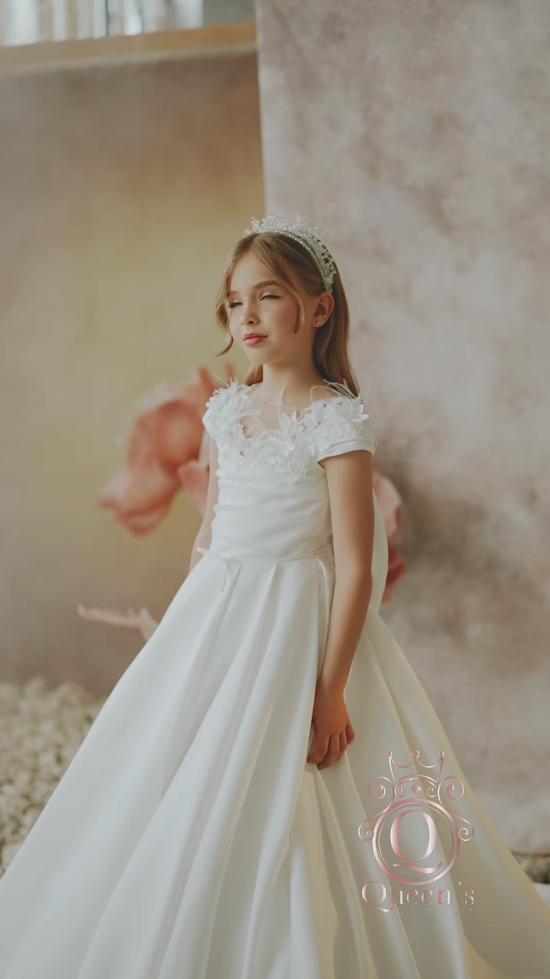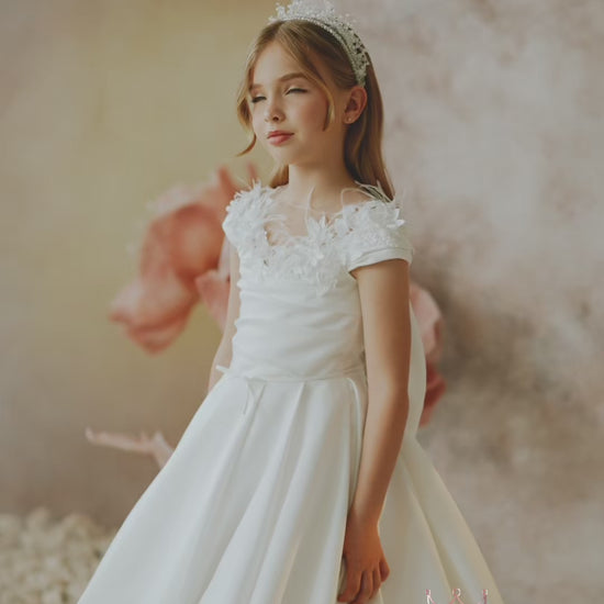 Celebrate her special day with a luxury First Communion dress that embodies grace, beauty, and sophistication. This exclusive design features stunning 3D flowers, delicate feathers, and a dramatic big bow on the back, creating a look that is both timeless and magical. Each detail is carefully chosen to highlight her radiant spirit and the significance of her faith journey.
