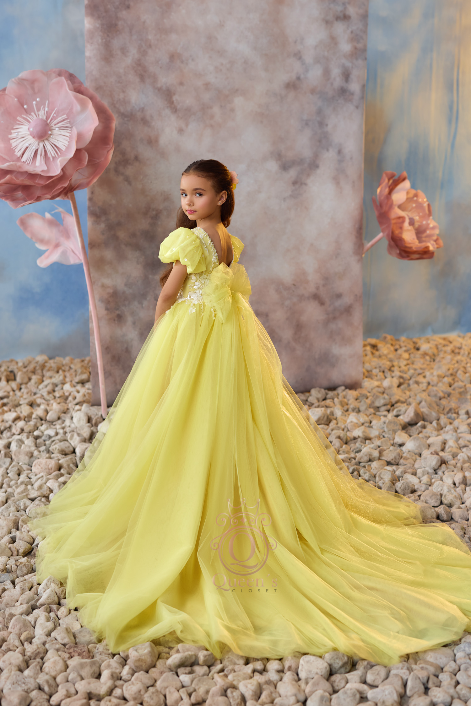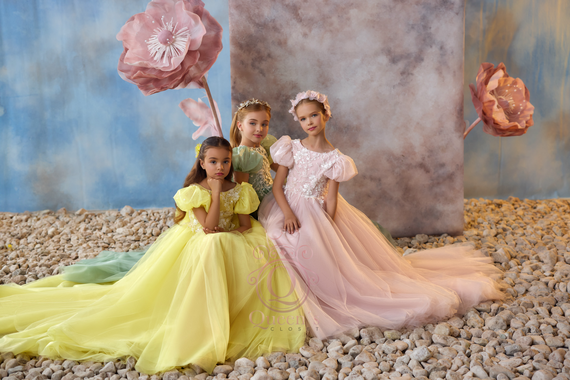 Three princesses, three colors, three worlds filled with wonder: radiant yellow, petal pink, and mint green. Each gown is crafted with ethereal tulle, puffed sleeves, and hand-placed floral appliqués that look like they bloomed straight out of a fairytale 🌿✨👗
