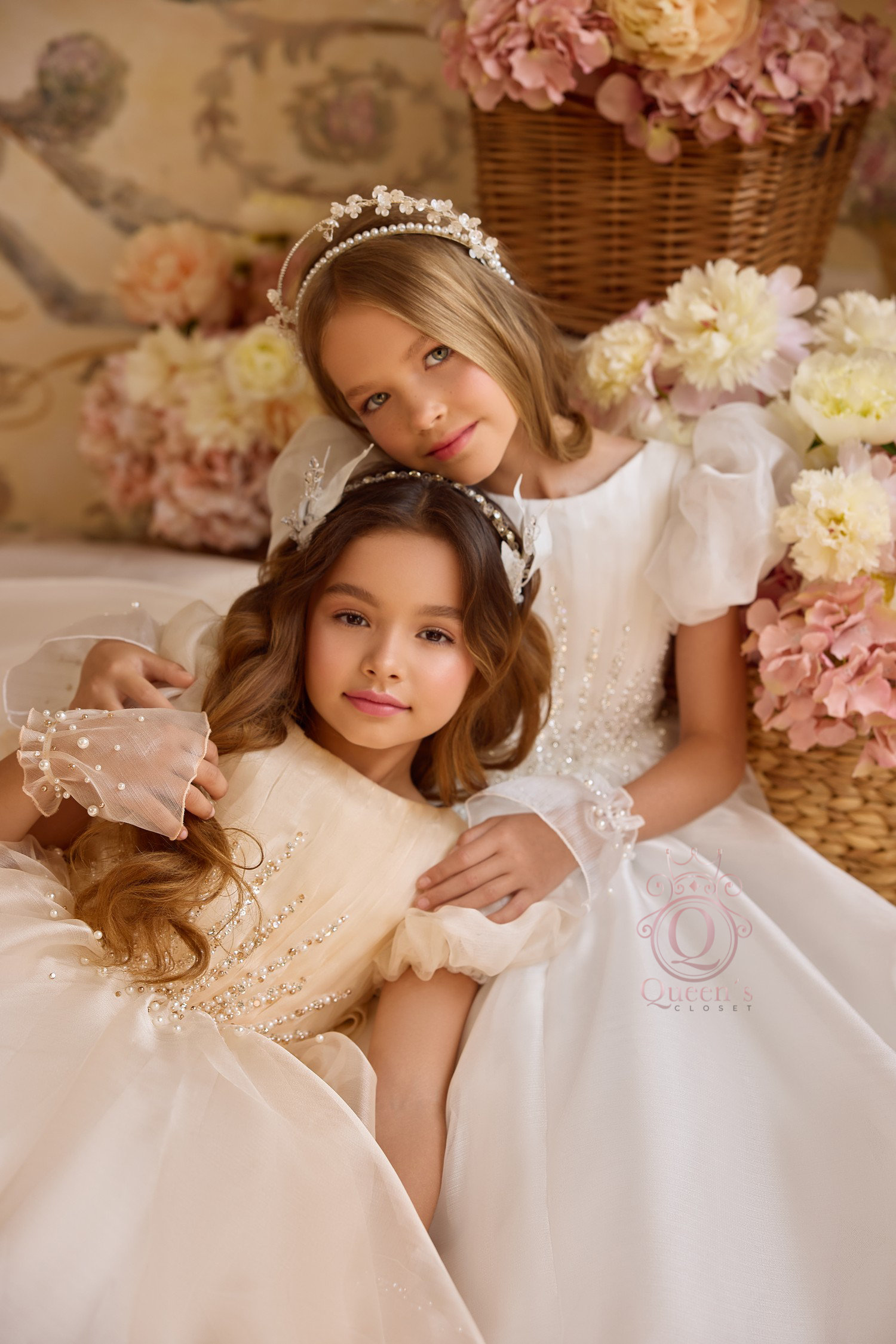 A breathtaking creation designed to capture the purity, elegance, and angelic beauty of your daughter’s most sacred day. This luxury gown features a soft, voluminous skirt made of layered tulle, creating an ethereal silhouette that glides with every step. The bodice is meticulously adorned with hand-applied pearls and shimmering crystals, forming delicate lines that highlight the waist and add a touch of radiant sparkle.