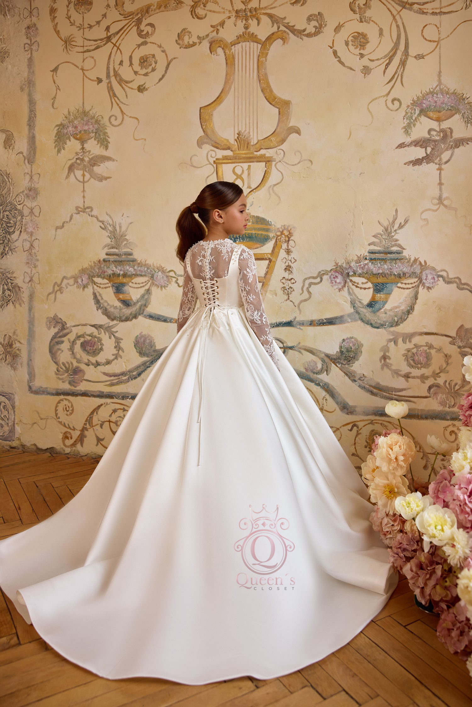 As with all Queen’s Closet creations, this dress is exclusive, unique, and custom-crafted to each girl’s exact measurements at no additional cost, ensuring comfort, beauty, and a flawless fit on her unforgettable day.