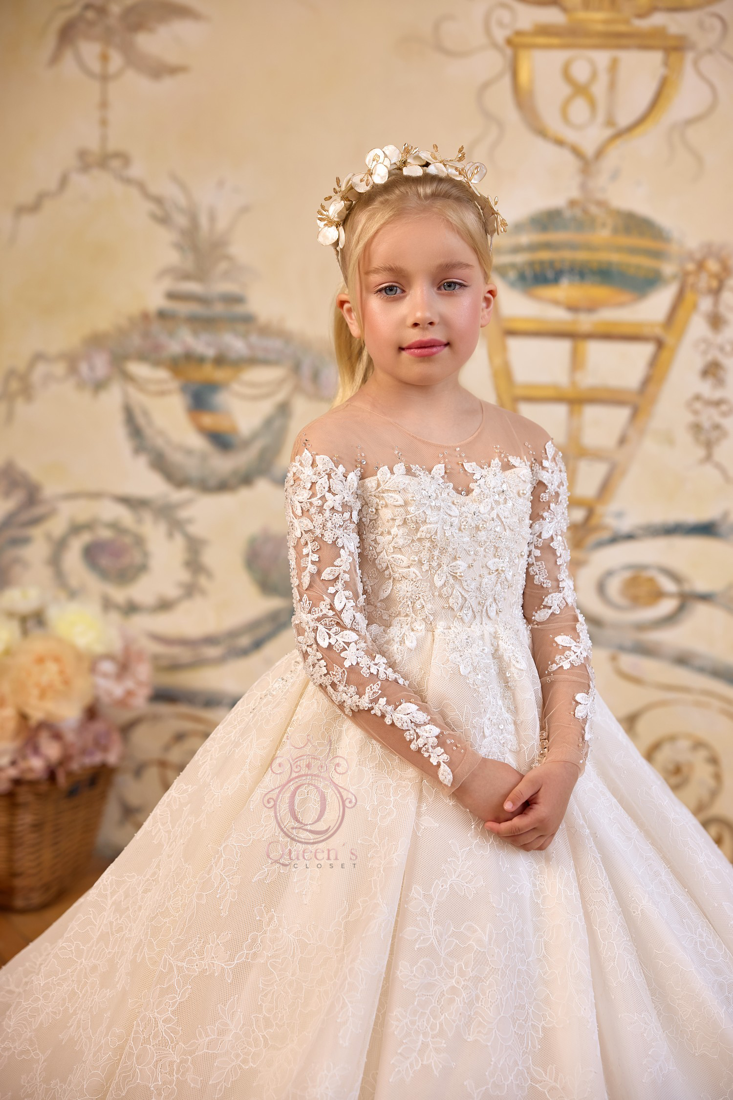 As with all our creations, this gown is exclusive, unique, and handcrafted using the precise measurements of each girl, ensuring a flawless, couture fit made just for her.